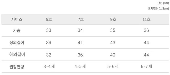 • 尺寸表依序為:尺寸、胸圍、衣長、褲長、建議年齡(虛歲)