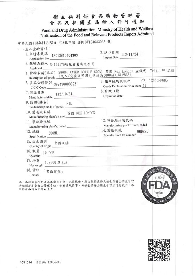 🌺 通過台灣衛生福利部食品藥物管理署輸入許可