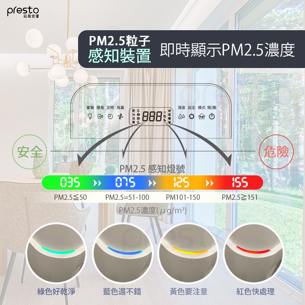 除了面板會顯示之外,還有PM2.5感知裝置燈號,四段燈號能夠及時知道空氣品質喔!
