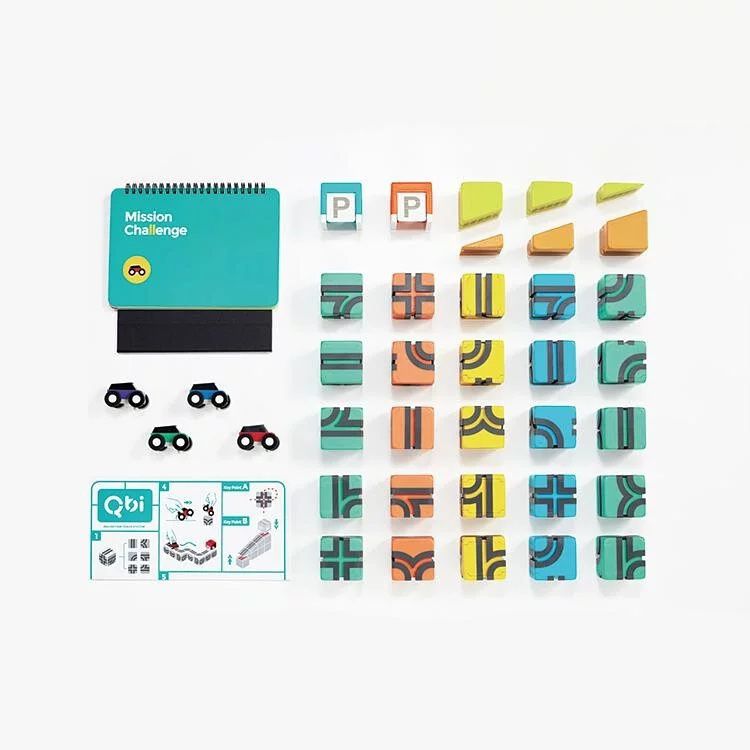 Qbi 的六個面有不同形狀的軌道,讓孩子動動腦,孩子初入手時可以先試著組出「讓車子順利前行的軌道」,幾次引導後就能自創許多有趣的軌道組合,還可以設計路障、關卡,空間邏輯概念就這樣潛移默化被奠定了!