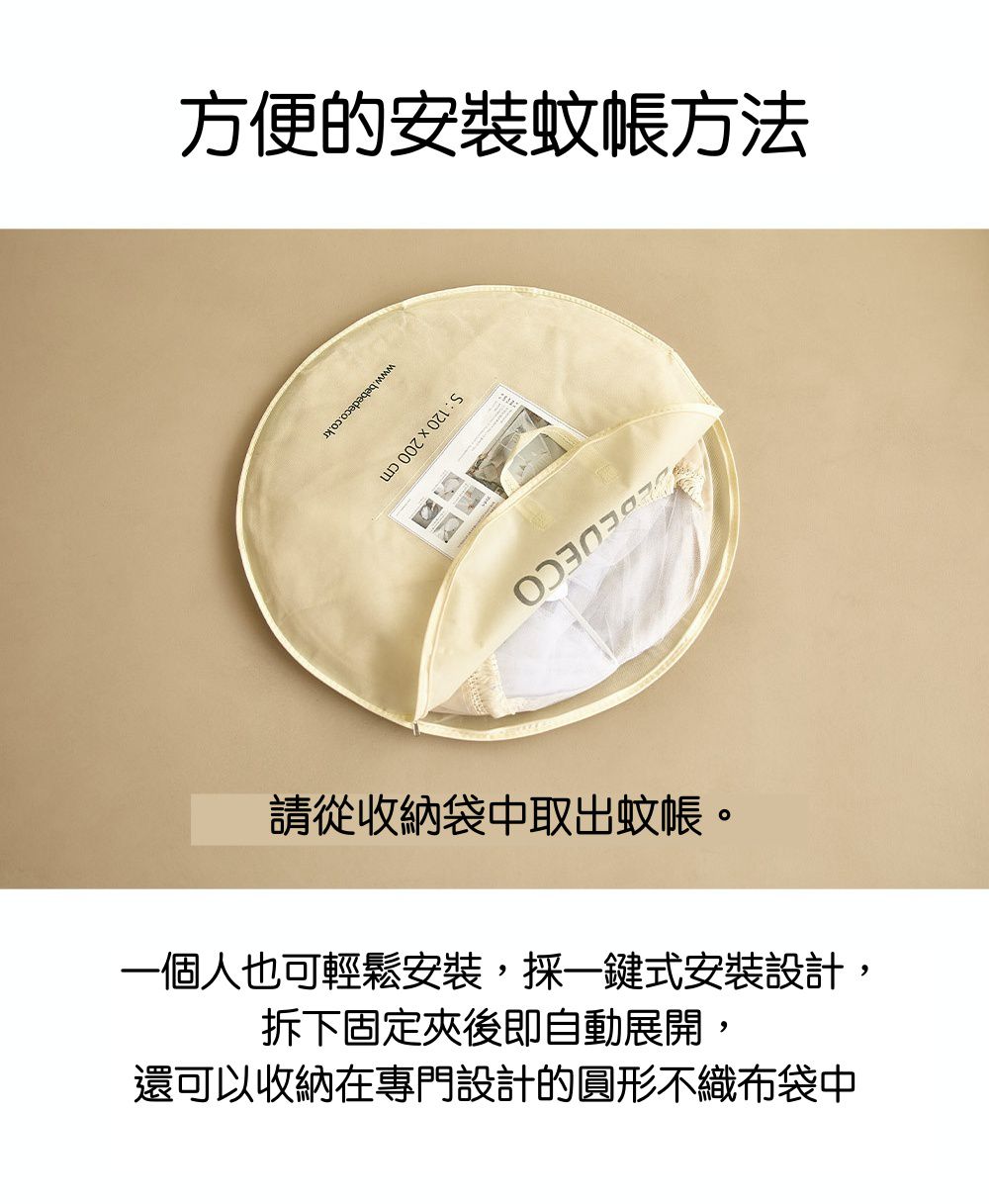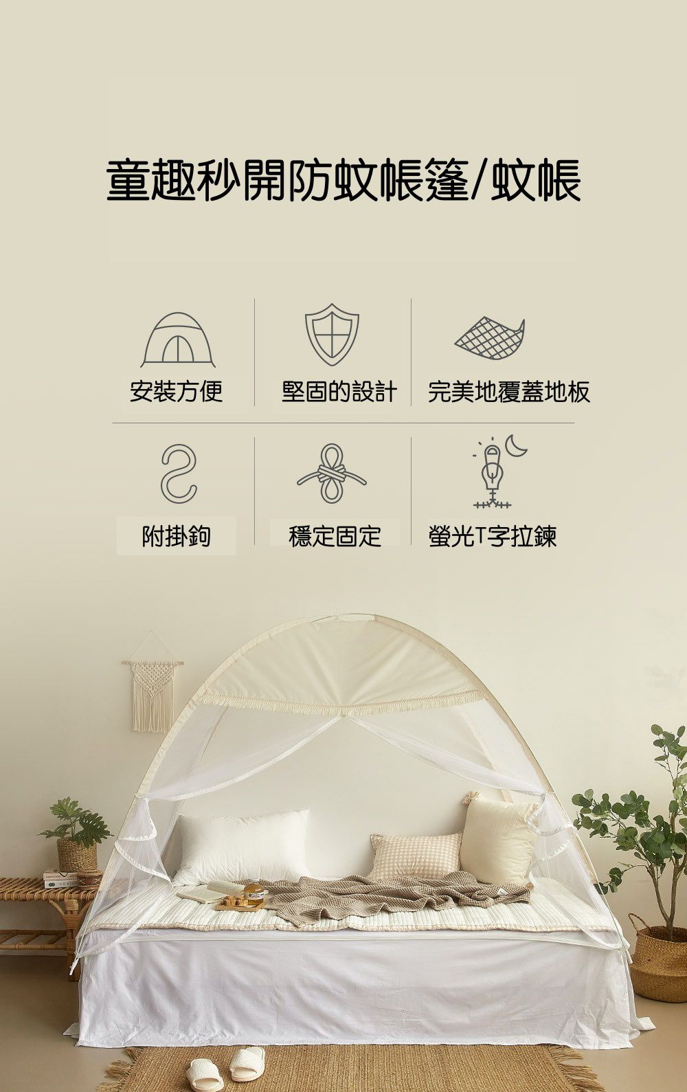 安裝在床上也很方便~不會像以前那種阿嬤蚊帳,還要在牆上釘釘子再找地方掛!只要這樣放在床上,把四邊拉平整就OK喔~(有大小兩種尺寸,本拍攝蚊帳是S尺寸120x200x140cm,示範床為110x200cm)