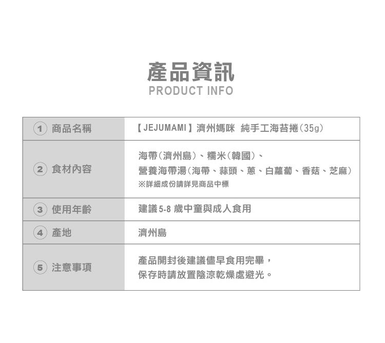 • 品名:濟州大海的禮物 純手工海苔捲單入