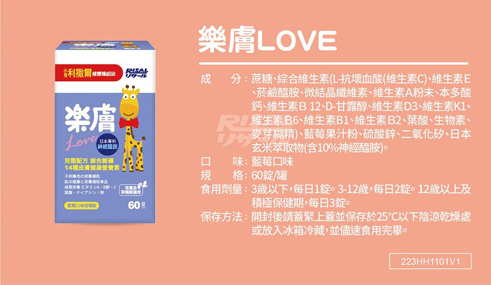小兒利撒爾Risal - 樂膚Love咀嚼錠x兩瓶組(加贈小魚球10粒x兩盒)-60錠/瓶
