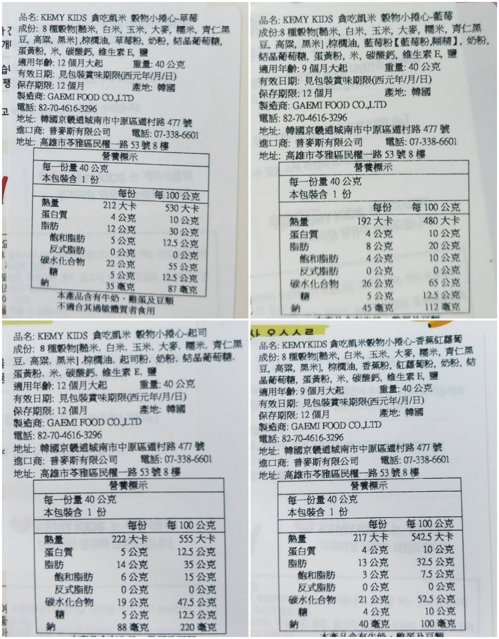• 成分:8種穀物[糙米, 白米, 玉米, 大麥, 糯米, 青仁黑豆, 高粱, 黑米] ,棕櫚油, 起司粉(乾酪粉、磷酸氫二鈉), 脫脂奶粉, 結晶葡萄糖, 蛋黃粉, 糖, 碳酸鈣, 維生素E(抗氧化劑), 鹽