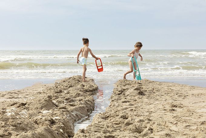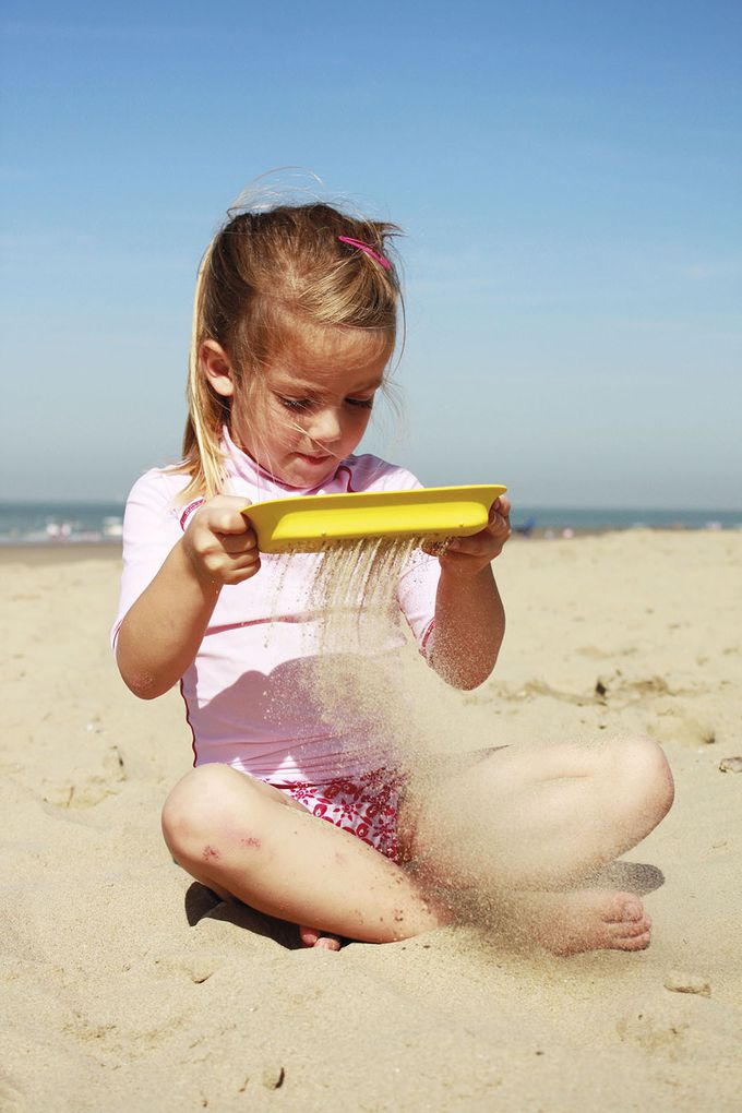 設計符合人體工學,有個位子可以讓孩子放腳,有個施力點可以挖起更大份量的沙。沙鏟上會有一塊可拆式黃色的板子,可以用來過濾沙子。