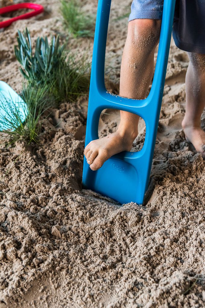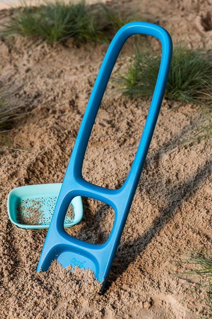 設計符合人體工學,有個位子可以讓孩子放腳,有個施力點可以挖起更大份量的沙。沙鏟上會有一塊可拆式黃色的板子,可以用來過濾沙子。