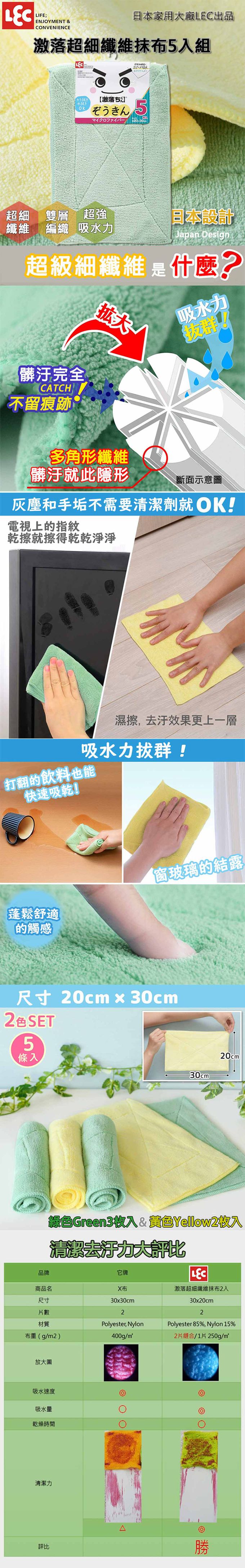 【產地】中國【數量】5入【尺寸】約20*30公分【特色】●無需使用清潔劑,超細纖維即能將髒污、灰塵等清除。●質地柔軟,不易刮傷清潔物品。【用途】居家清潔。【使用方法】※本品為乾濕兩用。●浸濕後擰乾水分擦拭,其清潔效果更加。●頑強污垢可沾些許清潔劑併用。【保存方法】●使用後以清水、肥皂或中性洗劑清洗後,將水分擰乾。●勿近火源或置於高溫潮濕、陽光直射處。【主要成分或材料】聚酯纖維85%、尼龍15%。