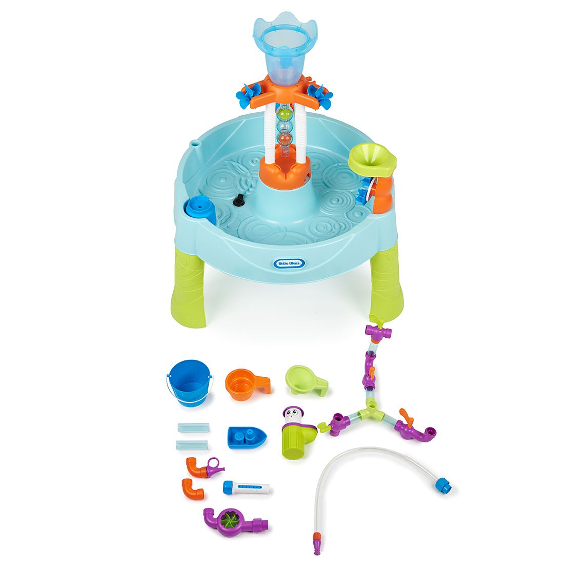 2. 適合孩童身高、多變有趣的STEM噴泉遊戲,透過水管的建構,讓水從3個噴嘴中個1個噴出來。