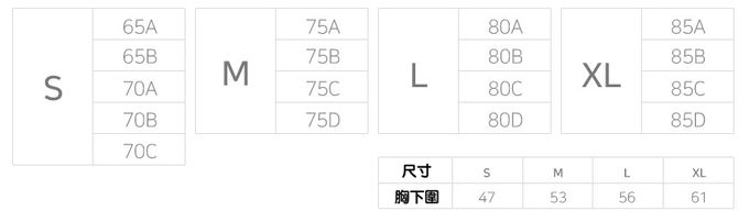 S[65A/B,70A/B/C]、M[75A/B/C/D]、L[80A/B/C/D]、XL[85A/B/C/D]