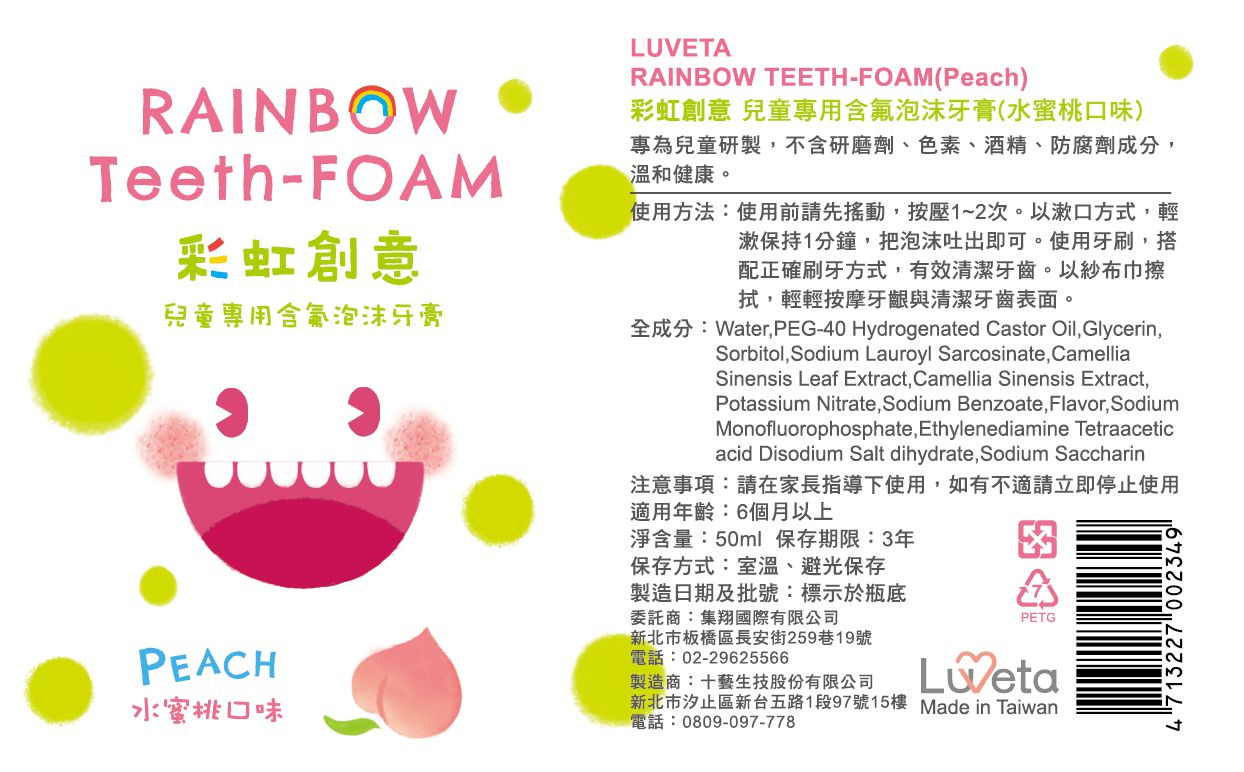 Luveta 樂唯他 - 兒童專用含氟泡沫牙膏-水蜜桃 (含氟量1000ppm)-台灣製