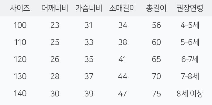 尺寸表:由左至右分別為:尺寸、肩寬、胸寬、袖長、衣長、建議年齡