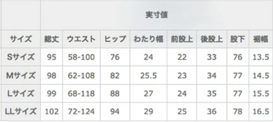 由左到右依序為總長、腰圍、臀圍、大腿寬、前褲檔、後褲檔、褲檔以下褲長、褲腳寬。(單位:cm)