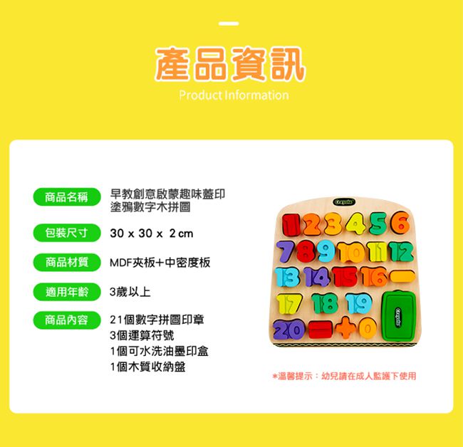 商品內容:含26個英文字母拼圖印章、1個可水洗油墨印盒、1個木質收納盒/含21個數字拼圖印章、3個運算符號、1個可水洗油墨印盒、1個木質收納盒