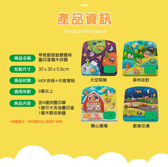 商品內容:含8個拼圖印章、1個可水洗油墨印盒、1個木質收納盒