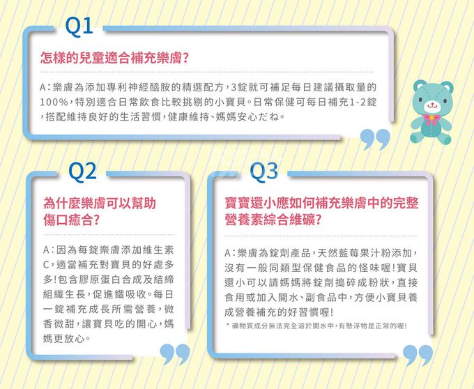成分:蔗糖、藍莓果汁粉、綜合維生素{L-抗壞血酸(維生素C)、生育醇(維生素E)、菸鹼醯胺、微結晶纖維素、維生素A粉末、本多酸鈣、氰鈷胺明(維生素B12)、D-甘露醇、膽鈣化醇(維生素D3)、維生素 K1、鹽酸吡哆辛(維生素B6)、硝酸硫胺明(維生素B1,硝酸噻胺)、核黃素(維生素B2)、葉酸、生物素、麥芽糊精}、聚乙烯吡咯烷酮、硬脂酸鎂、硫酸鋅、二氧化矽、日本玄米萃取物(含10%神經醯胺)