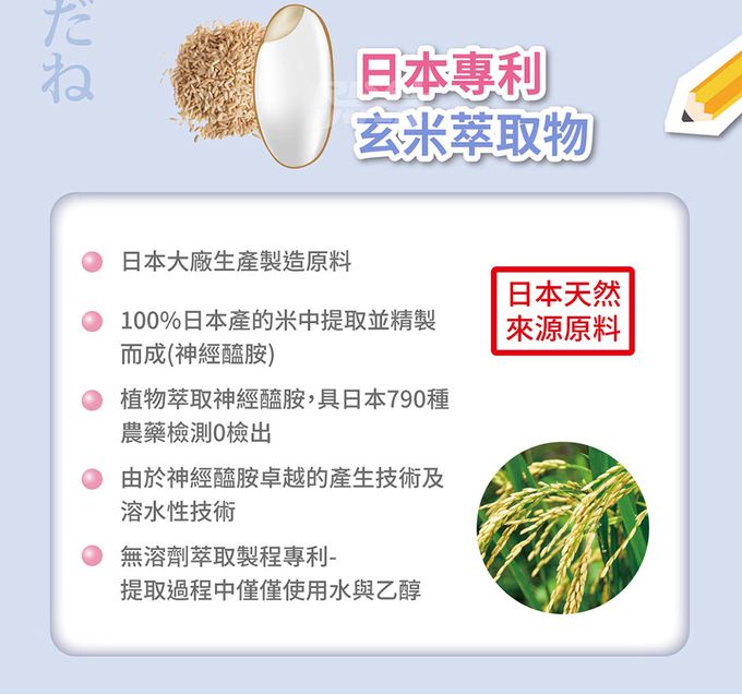 成分:蔗糖、藍莓果汁粉、綜合維生素{L-抗壞血酸(維生素C)、生育醇(維生素E)、菸鹼醯胺、微結晶纖維素、維生素A粉末、本多酸鈣、氰鈷胺明(維生素B12)、D-甘露醇、膽鈣化醇(維生素D3)、維生素 K1、鹽酸吡哆辛(維生素B6)、硝酸硫胺明(維生素B1,硝酸噻胺)、核黃素(維生素B2)、葉酸、生物素、麥芽糊精}、聚乙烯吡咯烷酮、硬脂酸鎂、硫酸鋅、二氧化矽、日本玄米萃取物(含10%神經醯胺)