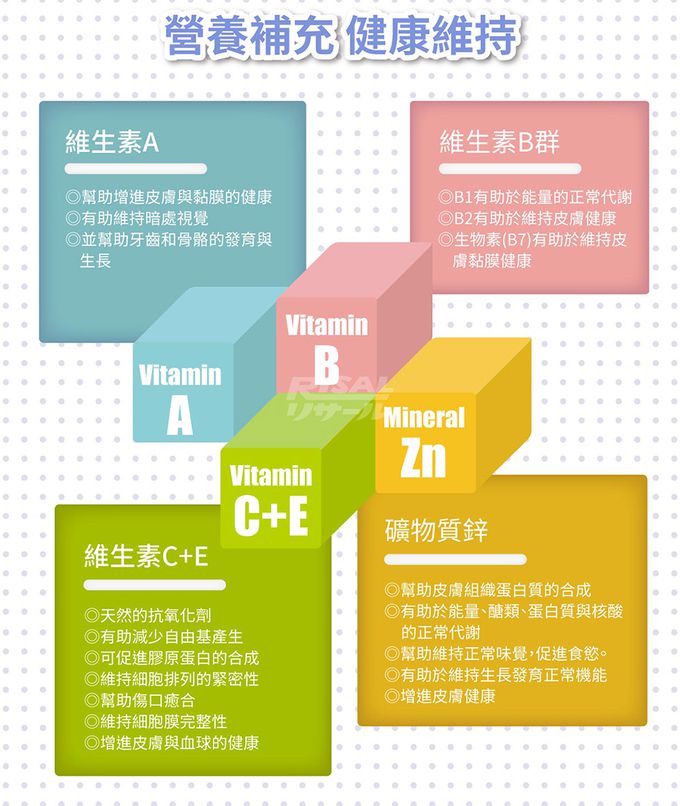 14種綜合維生素礦物質,維持肌膚及黏膜健康
