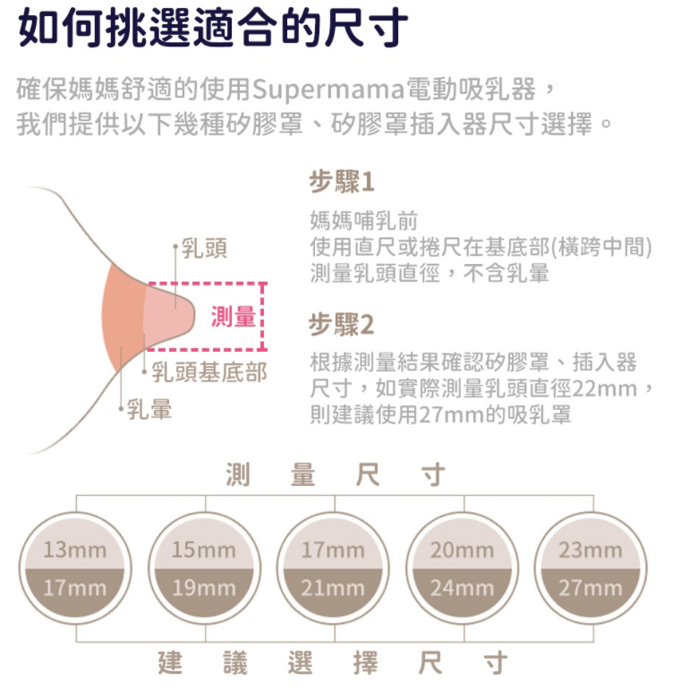 A.Supermama Air款是以罩杯內口徑與乳頭直徑的大小來做區分,Supermama無線電動吸乳器是搭配27mm的內口徑罩杯,360度貼和胸部,直接阻隔空氣,矽膠柔軟更服貼胸部,不會讓媽媽的胸部不舒服。如果媽媽的乳頭直徑小於24mm,可以再購買插入器配件搭配使用。