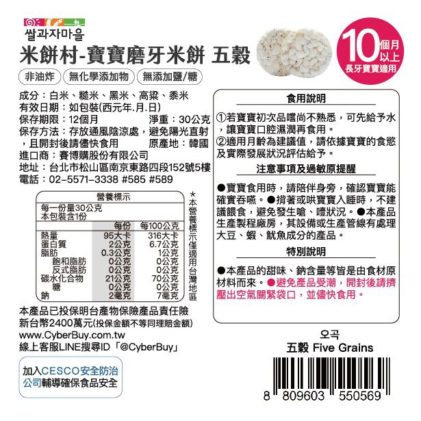 韓國SSALGWAJA米餅村 - 免運組-寶寶磨牙米餅-綜合5入組-五穀+綠米+紅麴+黑米+薑黃-30g/包,共5包