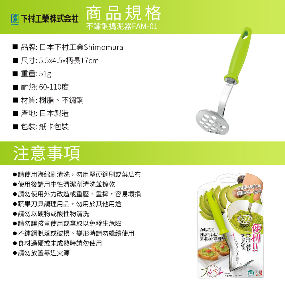 日本下村工業 Shimomura - 日本製不鏽鋼搗泥器FAM-01
