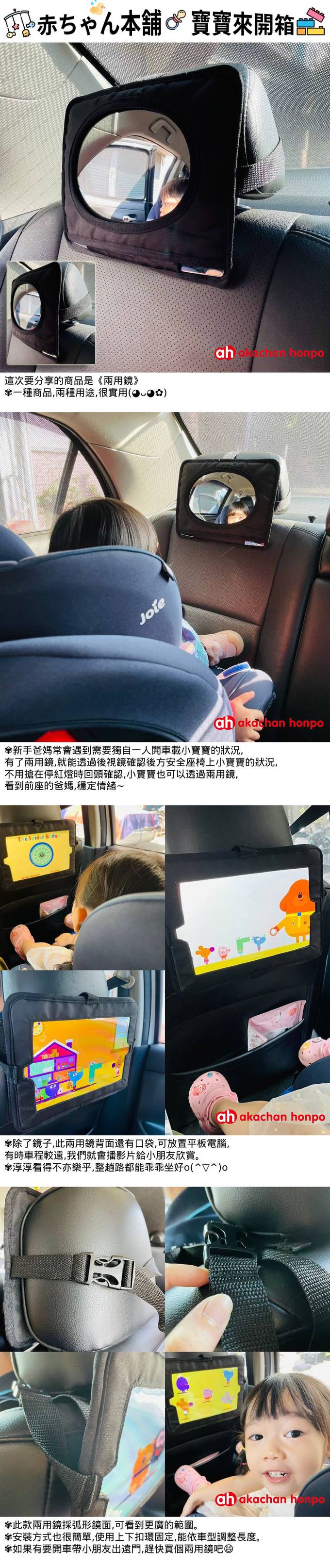 可不用回頭,僅需透過後視鏡即可確認朝後的幼兒安全座椅上的小寶寶的狀況。小寶寶也可以看見媽媽。弧形鏡面可看到更廣的範圍。有可以放平板電腦的口袋,可讓車內變成迷你電影院,增加兜風時的樂趣。從袋外也可操作畫面。