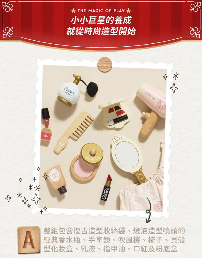 整組包含復古造型收納袋、燈泡造型噴頭的經典香水瓶、手拿鏡、吹風機、梳子、貝殼型迷你化妝盒、乳液、指甲油、口紅及粉底盒
