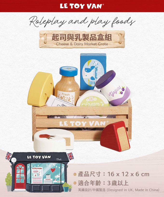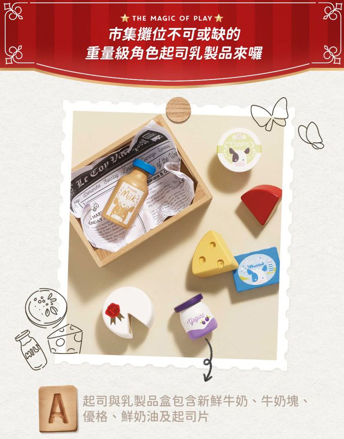 。起司與乳製品盒包含新鮮牛奶、牛奶塊、優格、鮮奶油及起司片。可與 "市集攤位大型玩具組" 相容,變成販賣的起司乳製品盒