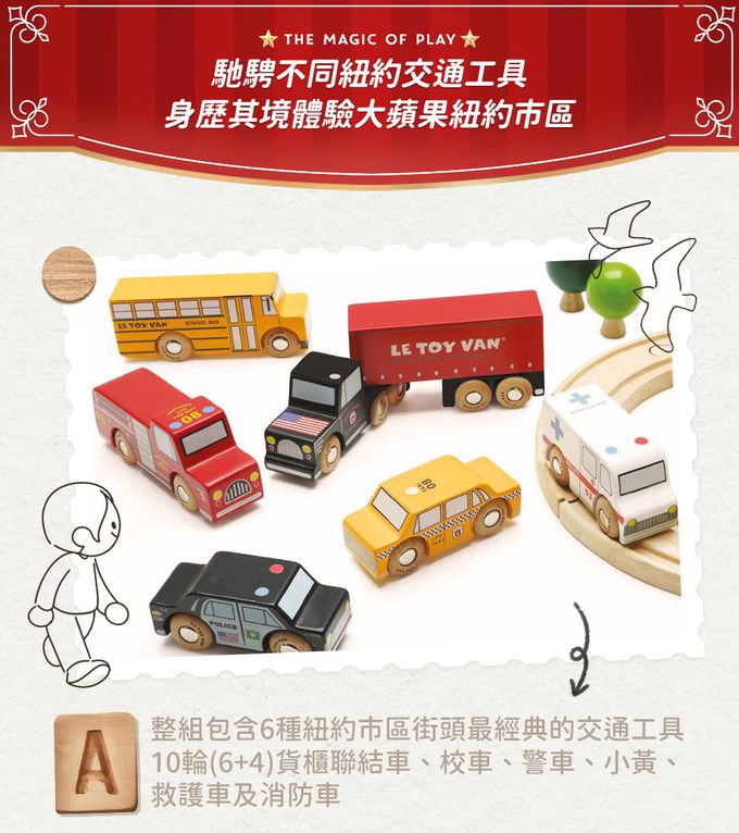 。整組包含6種紐約市區街頭最經典的交通工具,10輪(6+4)貨櫃聯結車、校車、警車、小黃、救護車及消防車