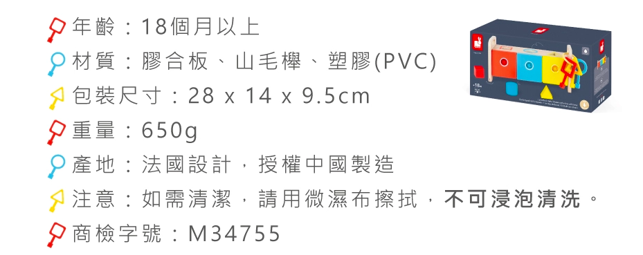 法國 Janod 形狀鑰匙盒結合數量、顏色、形狀三種基本認知,有1個黃色三角形,2個藍色圓形,3個紅色正方形,認識形狀和顏色的同時,還能學習數量的概念。
