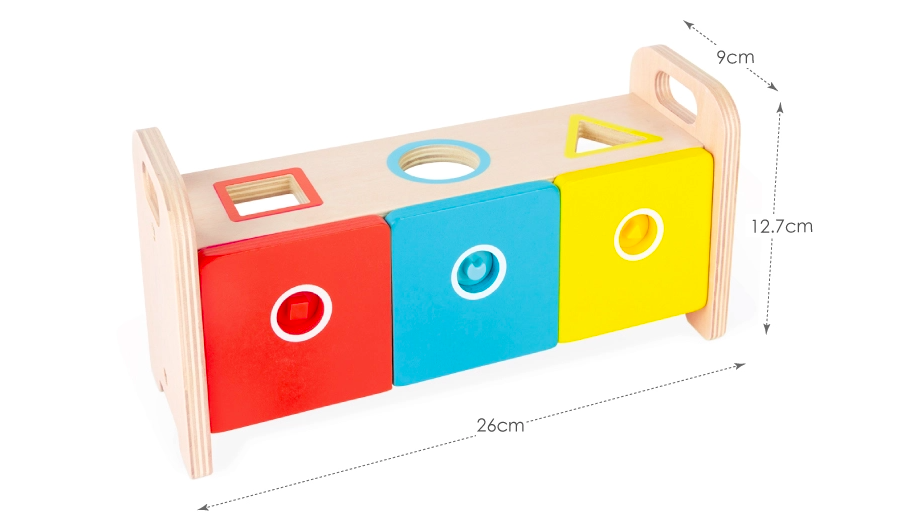 將和洞口相同的形狀丟入盒子中,孩子可以看著鑰匙的形狀和顏色,就可以對應到正確的盒子,開啟鎖。轉鑰匙也可以鍛鍊孩子手部肌肉,練習精細動作。