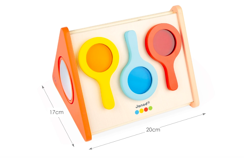 一拿到法國 Janod 魔術鏡子,紜紜就好奇的摸著翻轉著它,看看這面氣泡小鏡子,看見好多個自己!實在太有趣啦!Janod 魔術鏡子總共有 4 種鏡子:氣泡小鏡子,翻轉廣角鏡,三角形鏡子,凹型鏡子。讓孩子觀察不同鏡子的反射變形,千奇百怪的映象,激發孩子好奇心,反覆觀察玩樂。