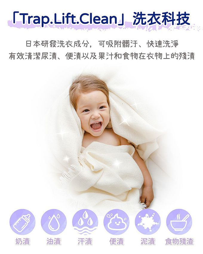 【產品特色】●最新成份能夠同時吸附髒汙、洗淨衣物,並不對衣物、洗衣機或肌膚造成傷害。●不論機洗或是手洗皆適用,並能有效洗淨尿漬、便漬以及果汁和食物在衣物上的殘漬。●低起泡,輕鬆洗淨不殘留。