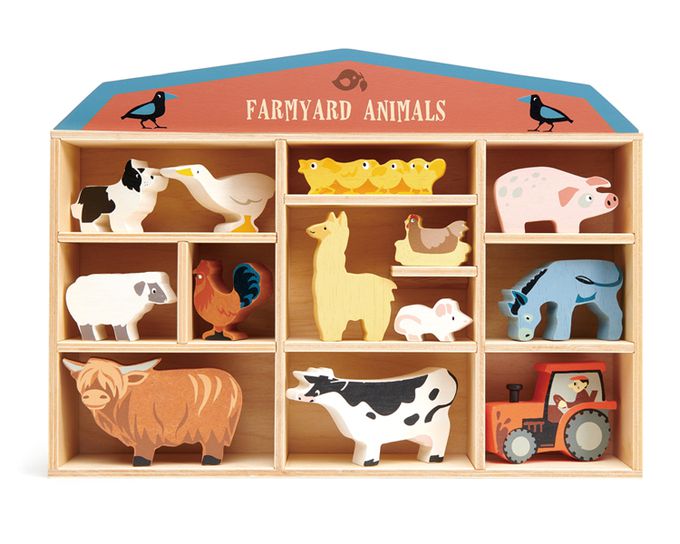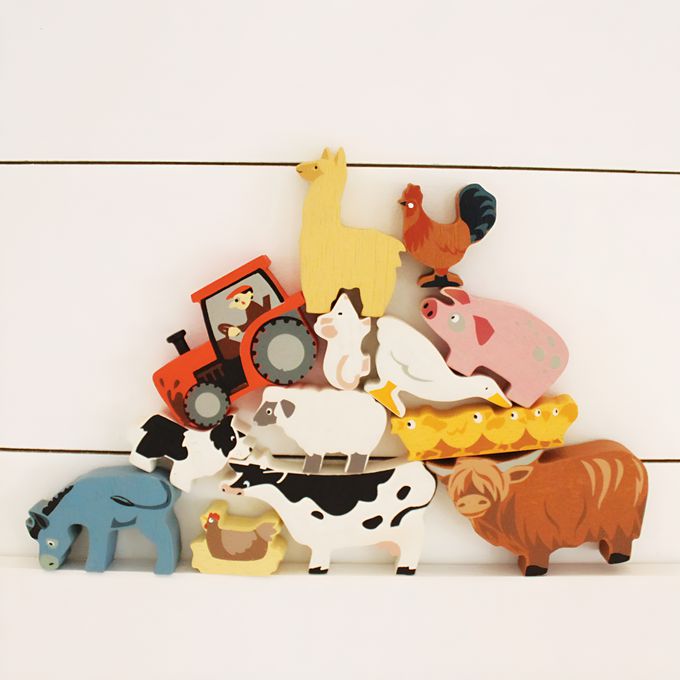 13種動物農莊積木(英國牧羊犬,鵝,綿羊,公雞,高地牛,小雞,羊駝,雞,白鼠,牛,豬,驢,拖拉機)。原木打造的動物家禽畜牧,充滿童趣的圖形設計,讓孩子在遊戲中培養美學能力,以及訓練小手肌肉的抓握和體驗平衡原理,是一款可隨身攜帶的簡易耐玩遊戲。