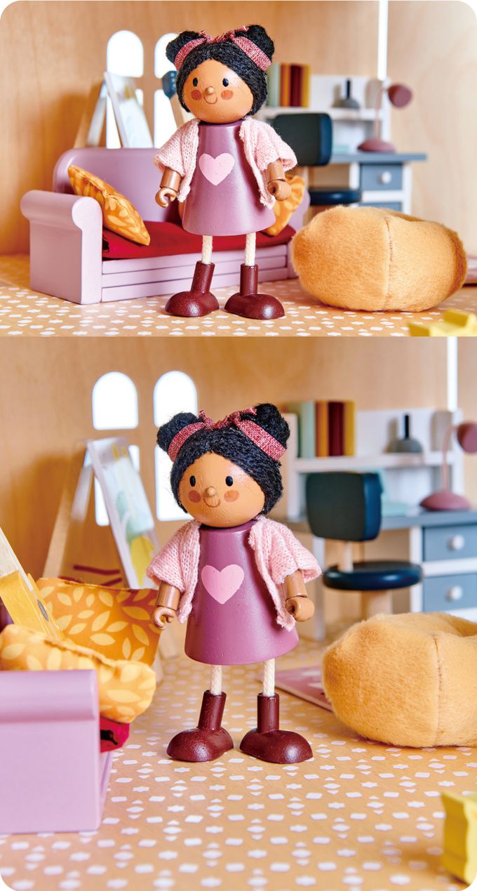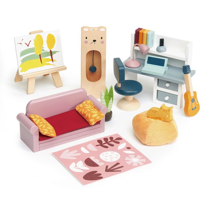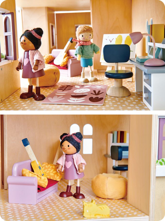 ★ 內含豐富的配件:時尚的旋轉辦公椅、書桌、筆電、手機架、檯燈、4本書、吉他、貓、豆袋、室內盆栽植物、漂亮的地毯和造型熊落地時鐘。還有含椅墊和2個印花枕頭的可拉出沙發,以及附有風景畫的木製畫架,提供多樣化的選擇。