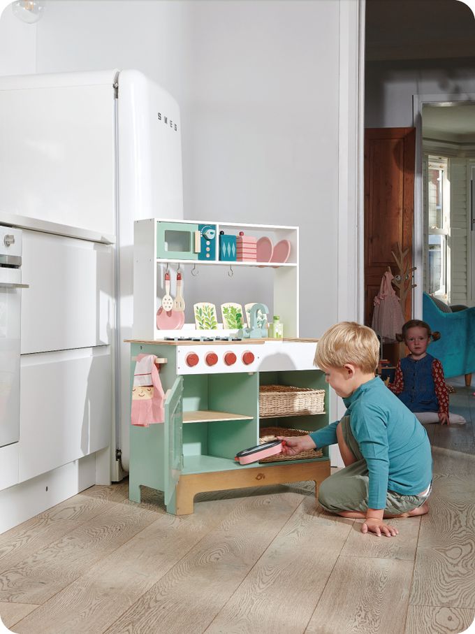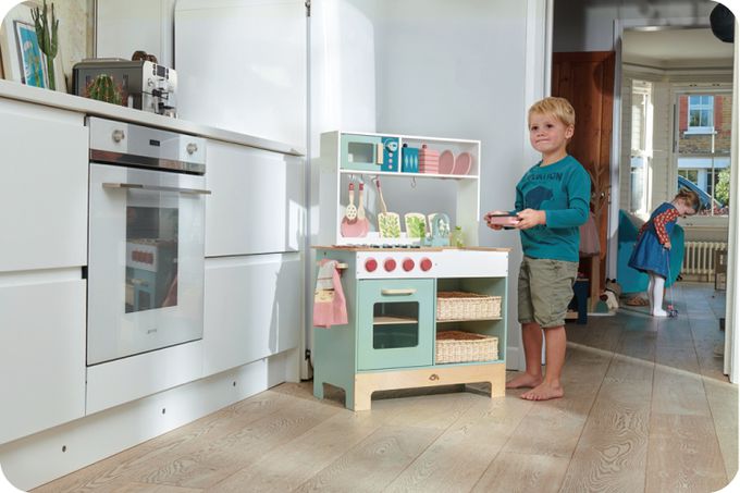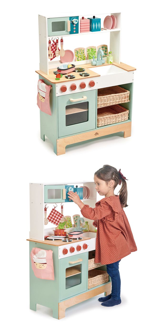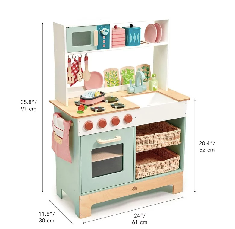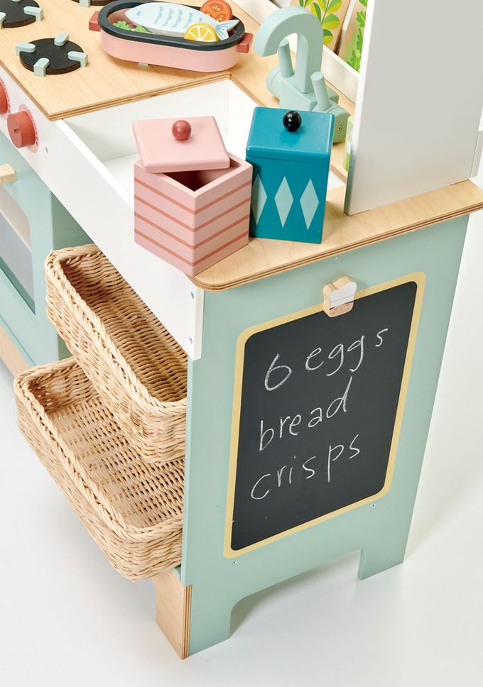 2 個柳編籃提供充足的存儲空間,用於存放家家酒系列中的其他食材配件。還附有2個木製儲物罐,3個香草架、3個漂亮盤子、1印有方格圖案的隔熱墊、一條印有迷你廚師圖案的茶巾,以及3個烹飪器具。