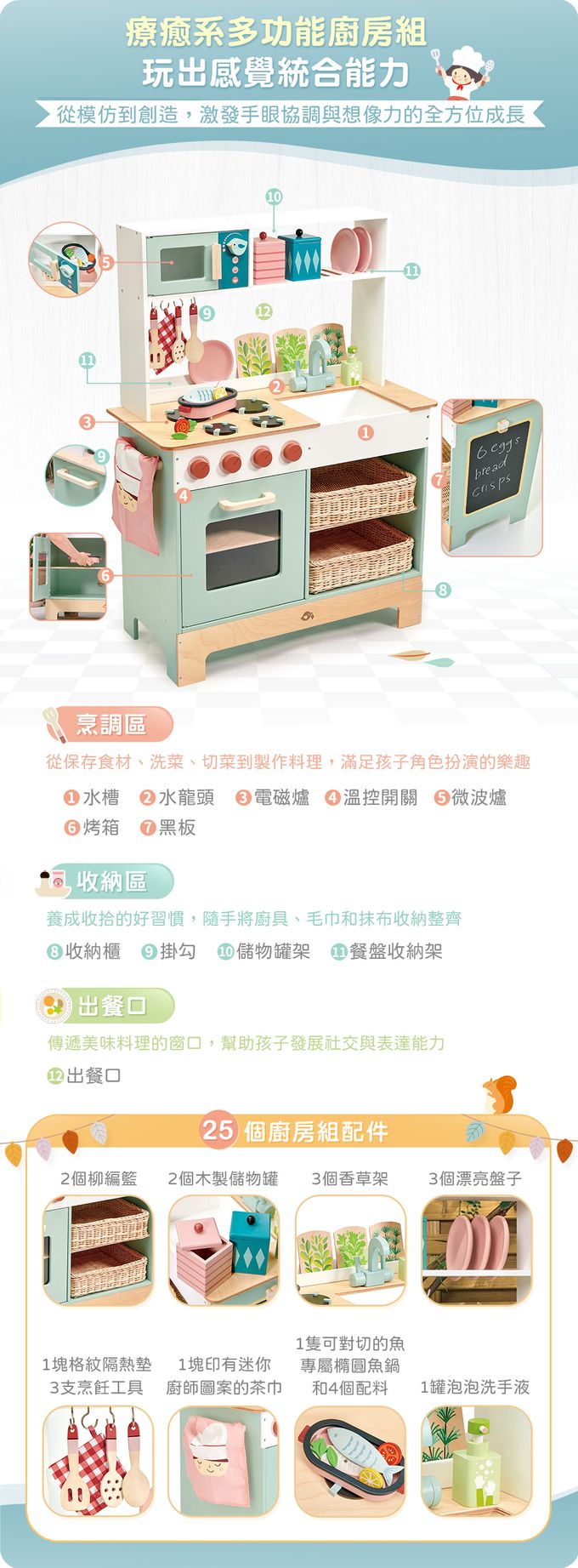 ★ 爐火設計搭配水槽、烤箱、微波爐,以及2個編織籃、餐盤架等廚房用具,大空間讓孩子大展身手。