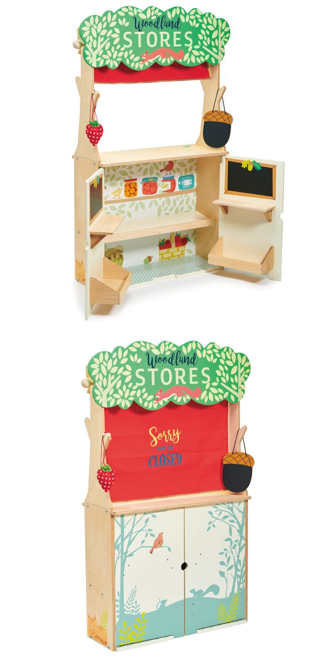 一款大型的遊戲商店,兩面都可以進行團體遊戲。一側是森林遊戲商店:它有2扇可打開的門,裡面是一家店舖,還有2個黑板區域可以塗鴉。有一個可拉下的窗簾,表示商店已打烊。在結構的另一面,商店變成森林戲院,我們還附上了2個可愛的布偶。一個橡實黑板,可以用粉筆寫上時間和日期,紅色的窗簾可以升起或放下,用於演出。