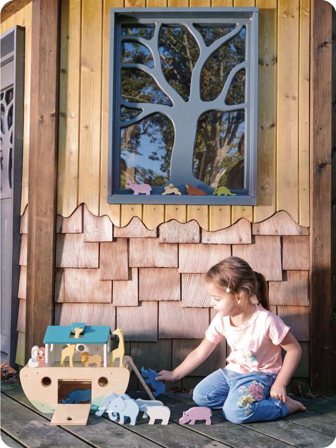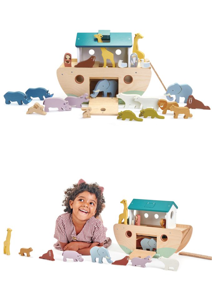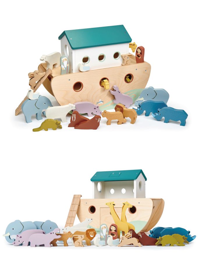 諾亞奇航從平面變成立體,藉由積木來說說關於諾亞方舟的故事並加深寶貝印象,且透過操作扮演來建立口說能力。隨著寶貝年齡增加,進而再分享諾亞奇航另一層更深的涵義。方舟的內部空間擁有雙層甲板,船身側有一個敞開的門,還有一個可掀式頂艙門。一端配有可兩兩接送的登船爬梯,屋頂上更有一扇讓高腳長頸鹿探頭的小窗戶!