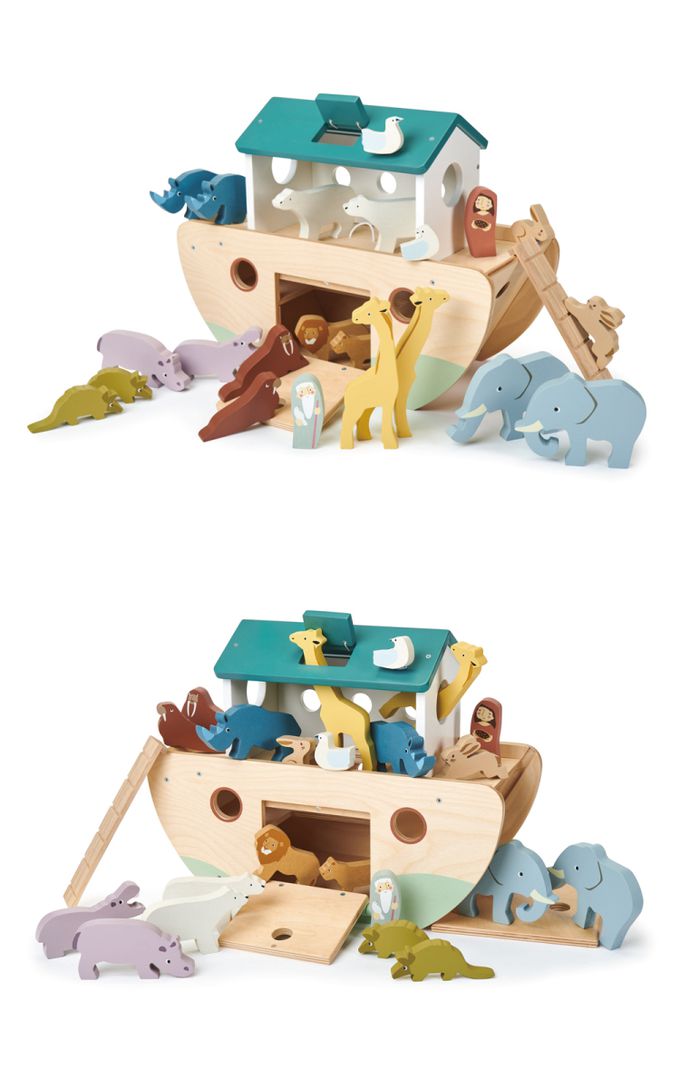 方舟的一側有一扇敞開的門,頂部有一個可以抬起的艙口,揭開後可以看到雙層甲板的內部。一端可以滑出,方便進入所有的動物,還有一個登船梯子,方便牠們兩兩爬上方舟。甚至在屋頂上更有一扇讓高腳長頸鹿探頭的小窗戶!諾亞先生和夫人收集了10對動物,你能分辨出哪些是公的,哪些是母的嗎?