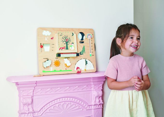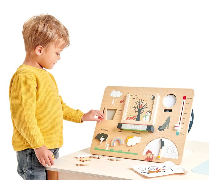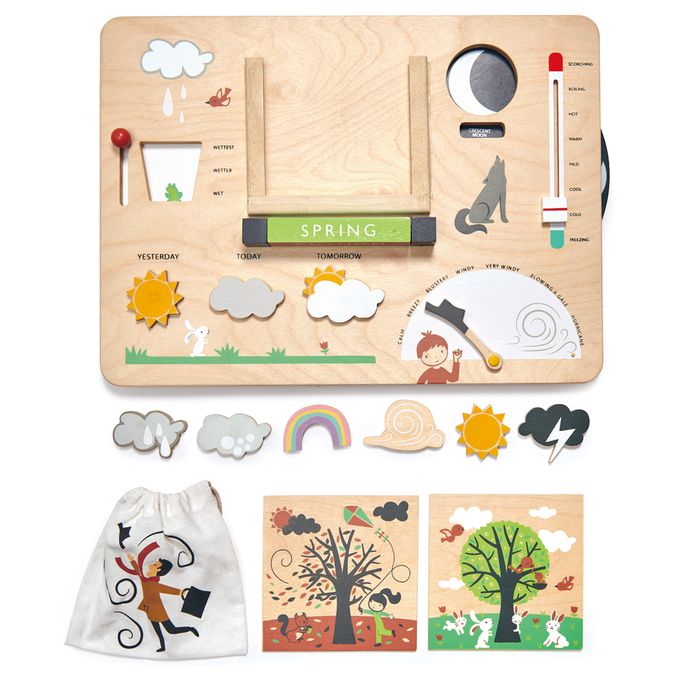 一款高品質的插圖木製氣象站,將氣候的各個方面整合到一個簡單而具有教育性的面板上,可以懸掛在教室牆上或在桌面上進行遊戲。降雨量、風速、溫度、季節以及每日的「今天天氣如何」,還有一個新穎的月相輪,教導關於週期的知識。