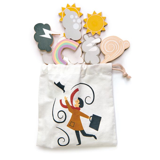 ★ 拉繩袋中存放著具有磁性的9個天氣符號,可貼於天氣預報面板上。