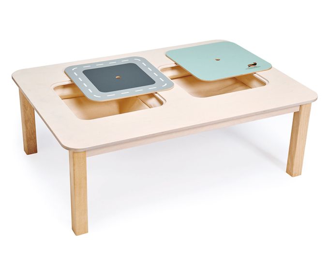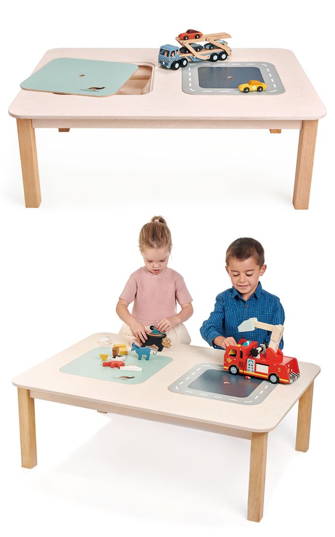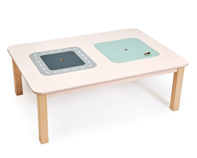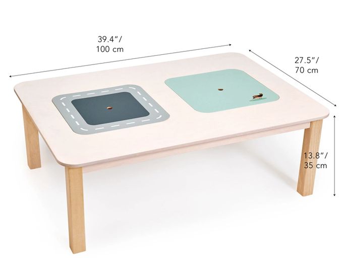 一張大型的白色遊戲桌,帶有2個堅固的儲物區。翻轉蓋子,一面印有道路圖案,另一面是柔和的綠色區域,配有可愛的小鳥插圖。非常適合放在桌面上進行各種遊戲,我們特別推薦用於火車組,因為儲物空間非常方便!