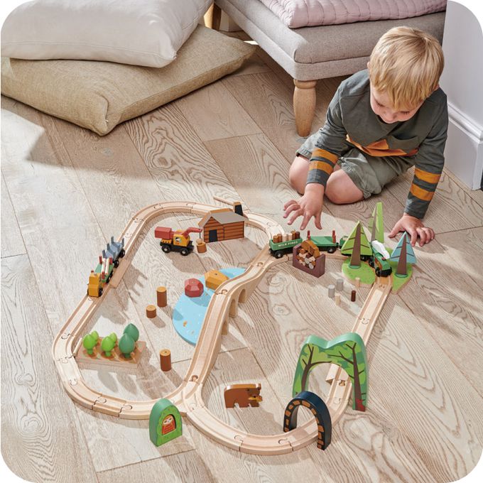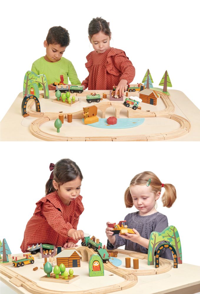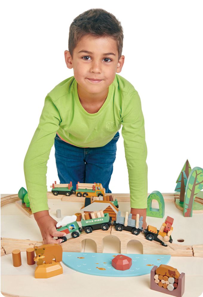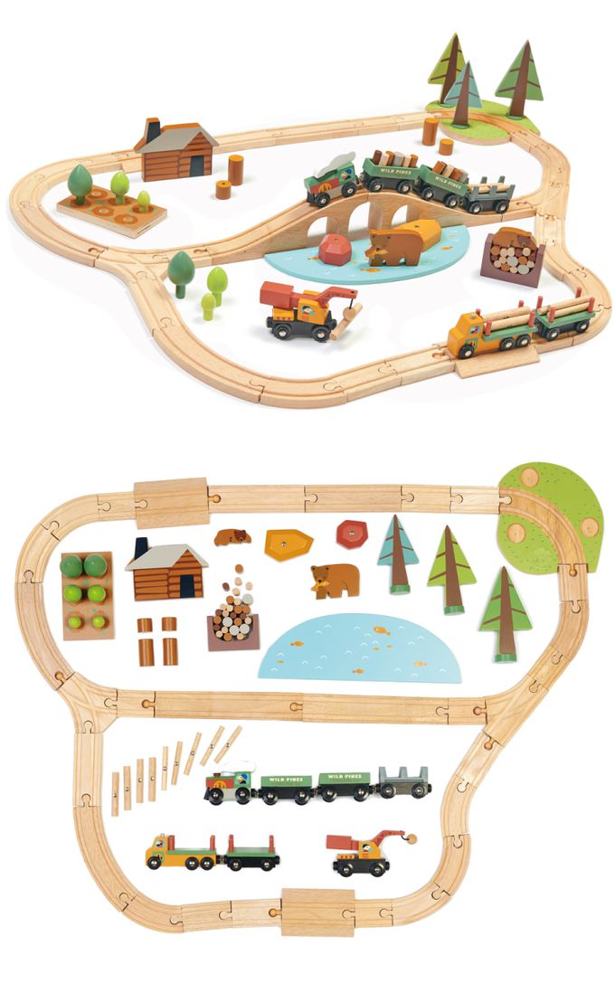 包含伐木循環遊戲所需要的一切:一個用來堆放沉睡圓木的圓木堆,2塊磁性巨石、叼著魚的大熊和湖泊,3棵大杉樹、4根鋸斷的木頭和一塊種植中的苗圃,裡面有6棵不同生長階段的樹木。