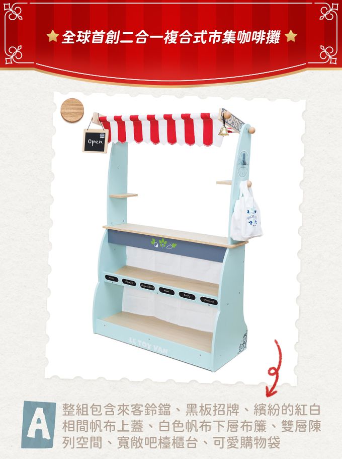。整組包含來客鈴鐺、黑板招牌、繽紛的紅白相間帆布上蓋、白色帆布下層布簾、雙層陳列空間、寬敞吧檯櫃台、可愛購物袋