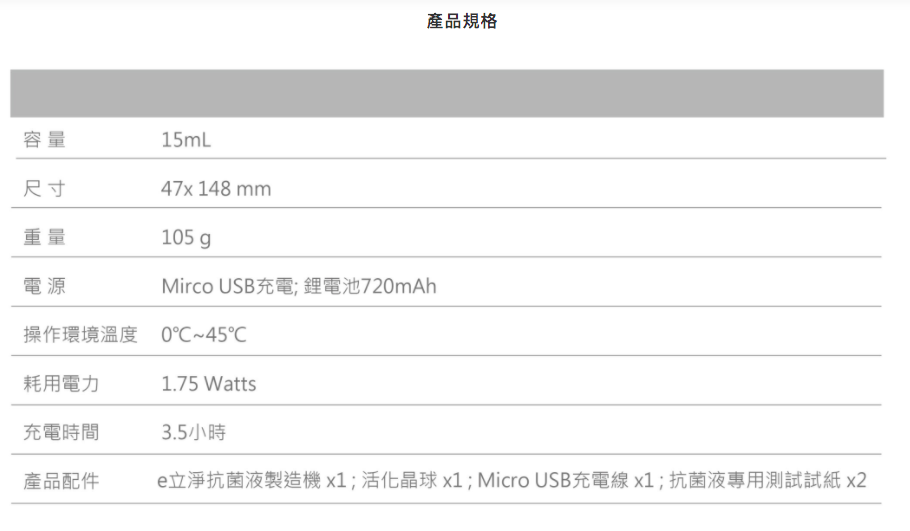 內容物包含:e立淨消毒噴霧製造機X1、USB充電線 X1(機器內建鋰電池)、使用說明書 X1、活化晶球(唯一耗材) X1組(每組晶球可電解150次)、測試試紙 X2入/組
