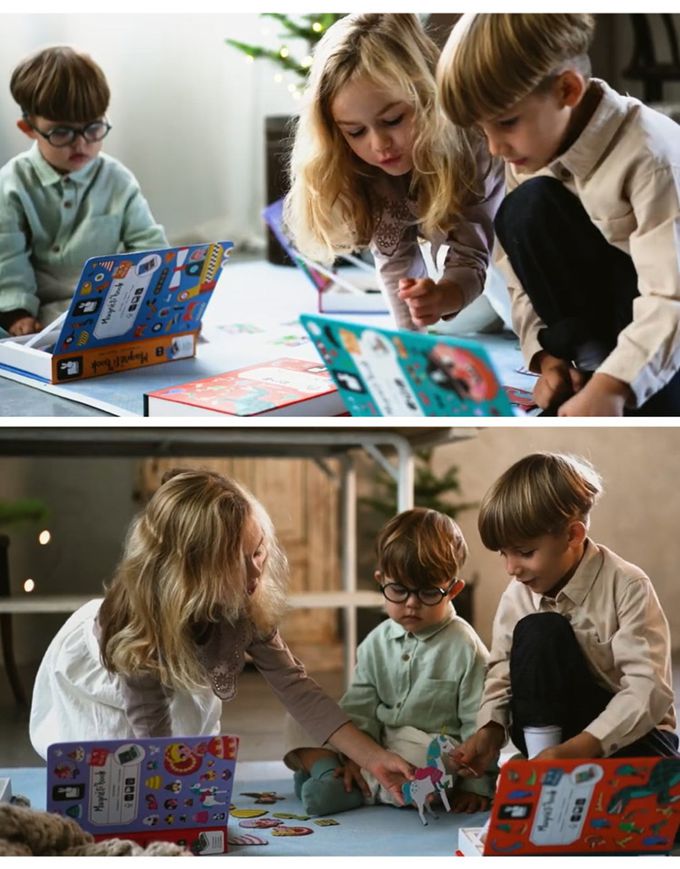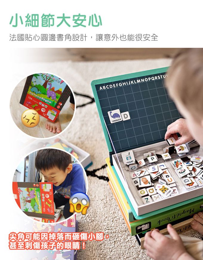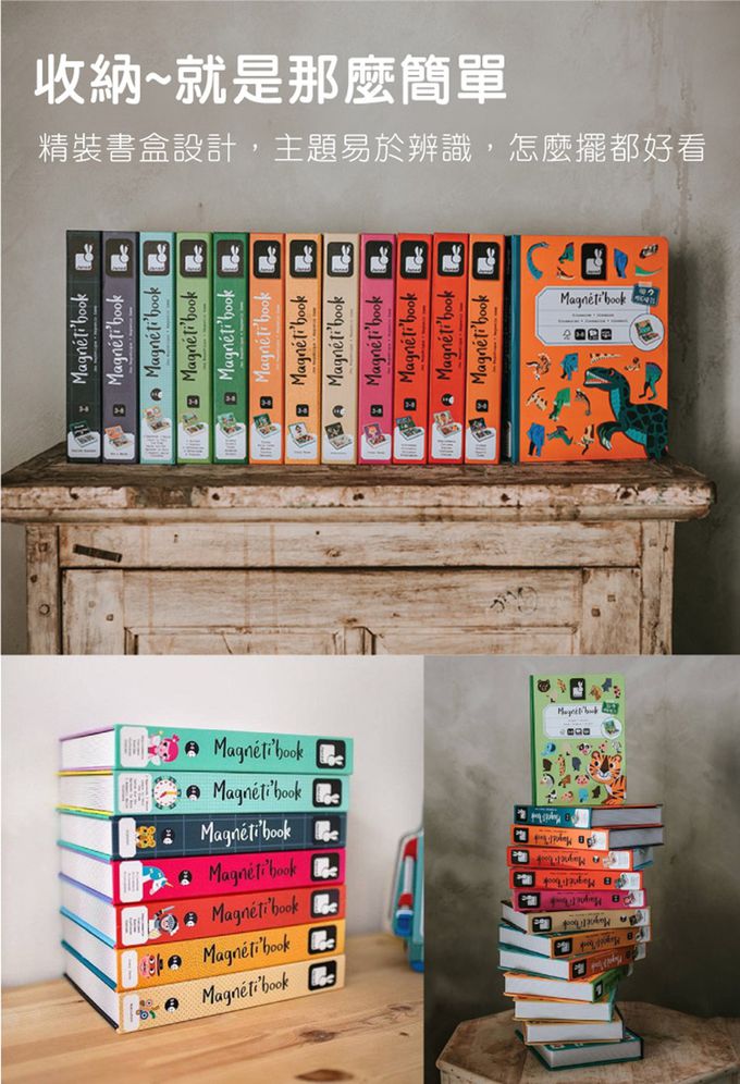 一般磁鐵書最怕的就是磁鐵東掉西掉,Janod就做成了書盒形狀,打開是一個場景,裡面的空間很好收納。每本書殼童趣可愛,磁卡厚度夠厚、不易折斷,邊角圓潤不刮手唷。