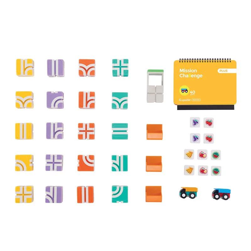 內容物:白色軌道方塊 x 20、貨物口袋 x 3、超市 x 1、迴力小貨車 x 2、水果卡 x 10、幼幼同樂挑戰卡(40題) x 1本