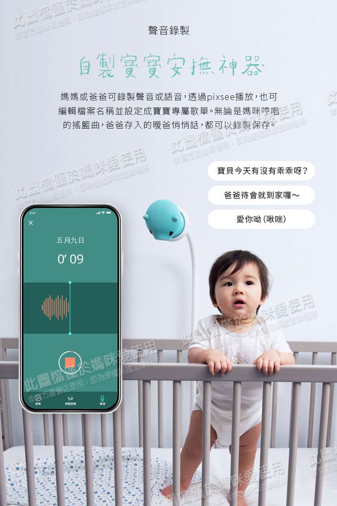 東比較西比較,終於讓小佩媽咪發現了 pixsee AI智慧寶寶攝影機 最吸引我的是其擁有業界最高影音規格『160度不失真超廣角,夜鷹近紅光科技(全暗房間也清晰),還能夠AI智慧自動捕捉照片』身為一個熱愛紀錄寶貝生活的媽咪,這真的超重要!而我覺得最酷的功能是『AI智慧哭聲偵測辨識+智慧音樂盒播放』仁寶研發團隊,搜集了全球200萬筆新生兒哭聲大數據,並以AI分析,能夠即時哭聲翻譯掌握寶寶生理狀況,給爸媽做參考,讓新手爸媽面對寶寶哭不再那麼焦慮!當寶寶哭的時候,pixsee還會自動播放與風潮音樂合作的放鬆音樂,安撫寶寶的情緒!超神奇又很貼心的功能~~~