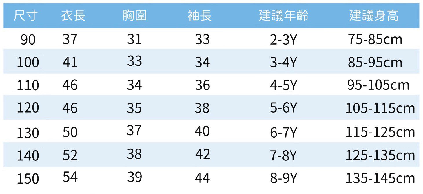 附上尺寸表給媽媽們參考,外套版型稍微偏大一點,喜歡合身的媽媽可以挑小一碼哦。