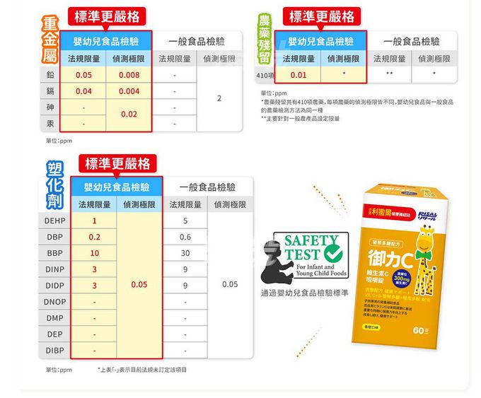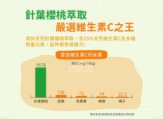 成分:糖粉、L-抗壞血酸鈉、L-抗壞血酸、硬脂酸鎂、針葉櫻桃萃取(含25%維生素C)、聚乙烯咯烷酮、酵母葡聚多醣、橙橘香料、Hesperidin橙皮萃取物
